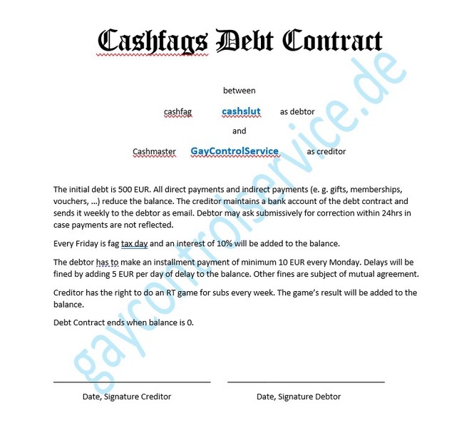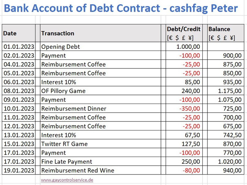 Get your individual Debt Contract - we define your initial debt and a weekly tax rate. Every Friday is Tax Friday and every Monday you pay an installment to reduce your debt. Extra reimbursements are possible and fines can be added ....